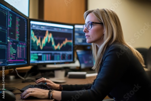 Woman analyzing data at contemporary office desk