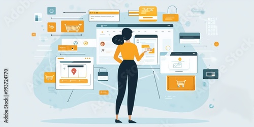 Woman analyzing online shopping trends with digital tools and interfaces in a modern setting