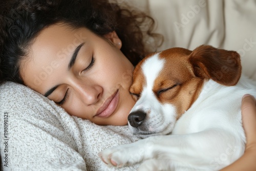 Woman and dog enjoy cozy moment together while resting on a soft couch at home during a peaceful afternoon