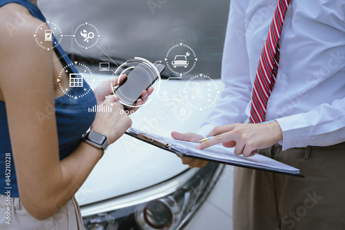 Woman and insurance agent claims process after car crash.