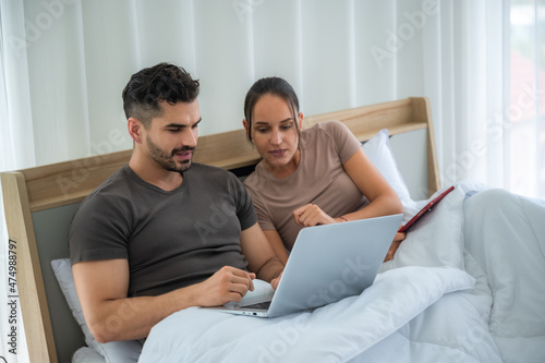 woman and man couple working online with laptop for business work at home, happy indoor lifestyle