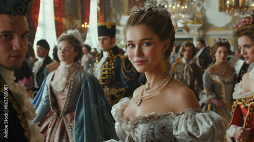 woman and man in regency outfits at an elaborate ball, surrounded by people wearing fancy , in the grand hall of castle