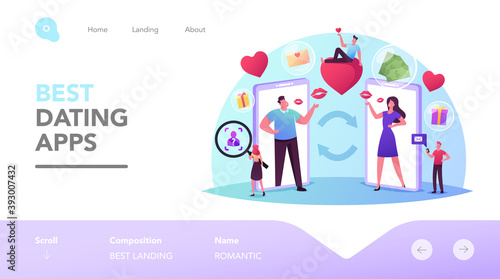 Woman and Man Searching Love Partner on Dating Web Site Landing Page Template. Virtual Relations, Chatting Online