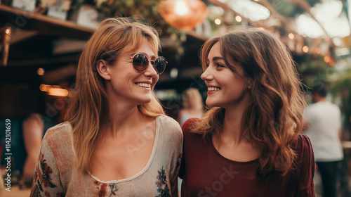 Woman, and young woman together laughing in urban scene for friendship, and social gatherings. Caucasian, and lifestyle portrait of woman with smile or joy at outdoor event