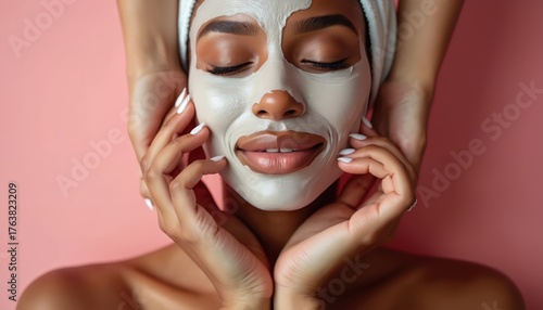 Woman applies white clay mask to face. Skin treatment process, self care routine. Hands gently touch skin for rejuvenation. Pampering beauty session.