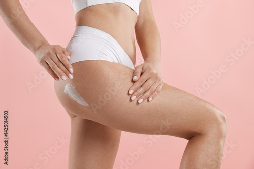 Woman applying anti cellulite cream on light pink background, closeup