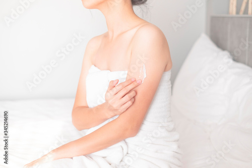 Woman applying arm cream,lotion , Hygiene skin body care concept..