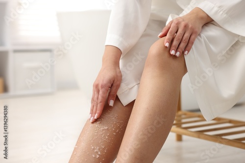 Woman applying body scrub onto her leg indoors, closeup. Space for text