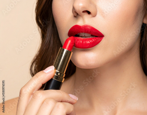 Woman applying bright red lipstick to her lips