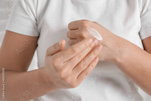 Woman applying cosmetic cream onto hand on blurred background, closeup