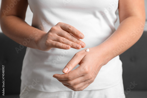 Woman applying cosmetic cream onto hand on blurred background, closeup