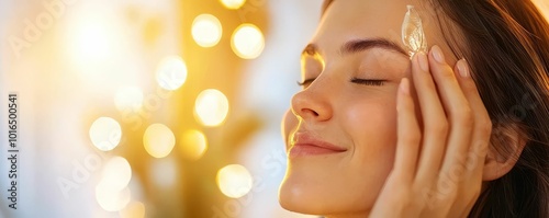 Woman applying luxury styling cream in front of a mirror, her glossy hair illuminated by golden light
