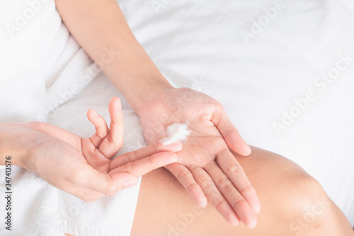 Woman applying moisturizing cream/lotion on hands, beauty concept..