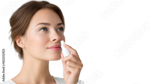 Woman applying nasal spray for relief, smiling gently, indoor setting with natural light, focus on health.