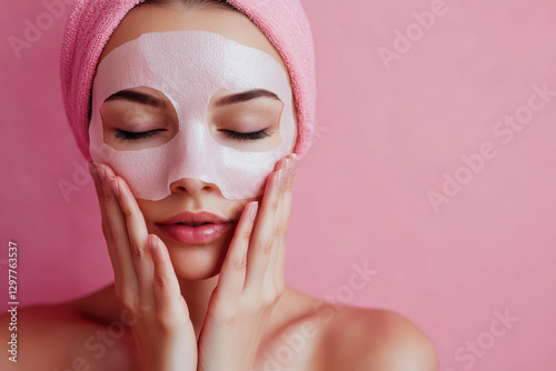 woman applying sheet mask on her face, relaxing against pink background. soothing atmosphere enhances her skincare routine, promoting self care and wellness