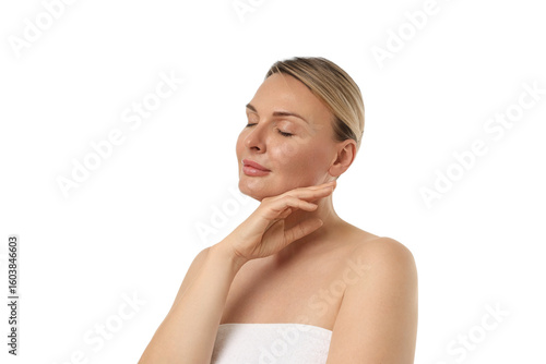 Woman applying skincare, calm and serene, isolated on white, PNG