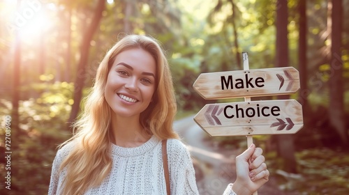 Woman at crossroad with two way sign, facing decision making and choosing the right path concept