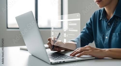 Woman at laptop filling out online form (digitally). Transparent overlay of questionnaire interface above laptop. Focus on digital forms, data entry, online tasks.