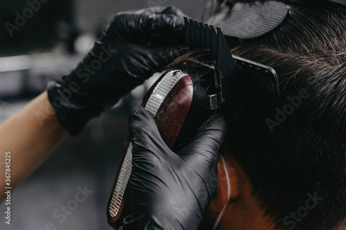 Woman barber cutting hair to a bearded man in face mask. Quarantine haircut concept.
