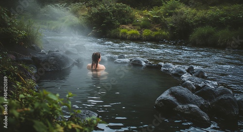 Woman Bathing in Hot Spring River Surrounded by Rocks