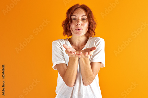 woman blow kiss at camera,redhead lady share love with everyone, isolated over orange background