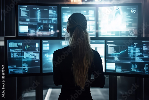 Woman builds containerized app environment while analyzing multiple screens in a tech workspace