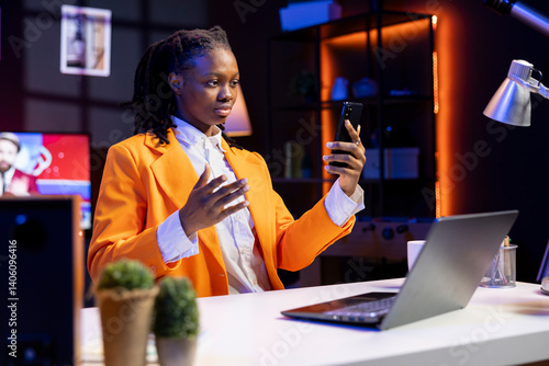Woman checking up on close friends during phone video conference meeting over the internet. Girl enjoying time together with friend in online video call session on smartphone while at home