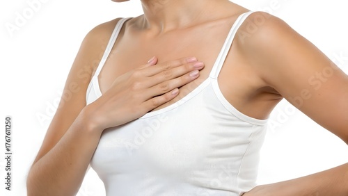 Woman checks her breast for lumps. Breast cancer awareness and self-examination concept; early detection of female health problems