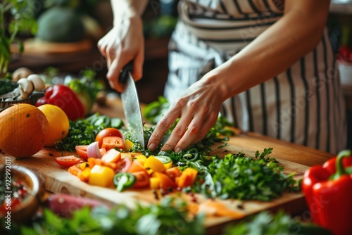 Woman chopping fresh vegetables on a wooden cutting board.
