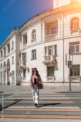 Woman city road crossing. Stylish woman in a hat crosses the road at a pedestrian crossing in the city. Dressed in white trousers and a jacket with a bag in her hands.