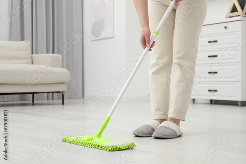 Woman cleaning dirty white parquet floor with mop at home, closeup. Space for text