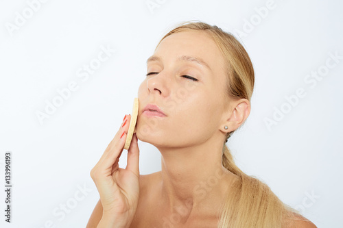 Woman cleaning her face. Beautiful young woman with clear-up pat