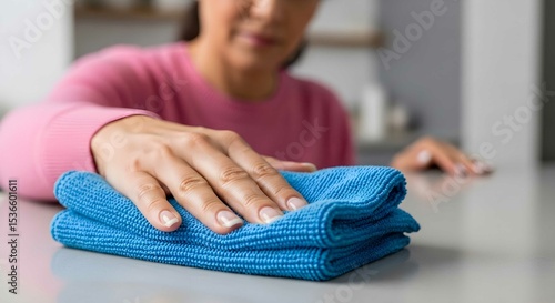 Woman cleaning kitchen counter with blue microfiber cloth. Housewife doing household chores, surface hygiene concept.