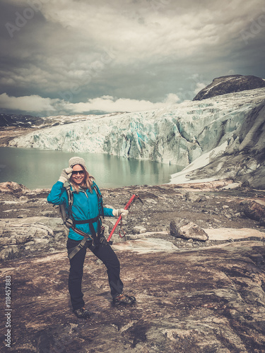 Woman climber standing near Jostedalsbreen glacier.