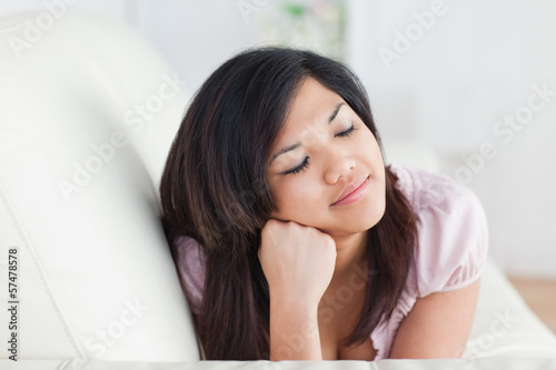Woman closing her eyes while resting on a couch