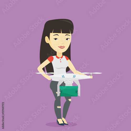 Woman controlling delivery drone with post package