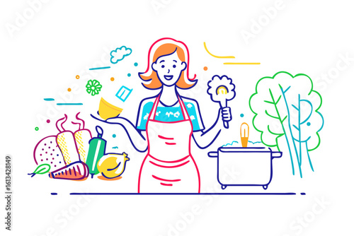 Woman cooking with fresh vegetables and ingredients in a stylized line art illustration kitchen food