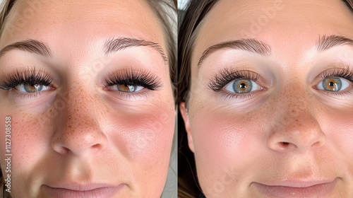 Woman, Cosmetology Beauty Procedures, Banner with copy space, eyelash extensions, before and after