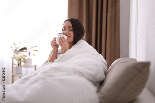 Woman covered in blanket drinking cup of hot beverage on sofa
