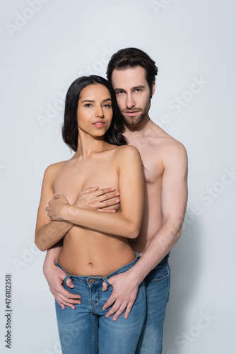 woman covering breast with hands near shirtless man holding thumbs in belt loops of her jeans on grey.