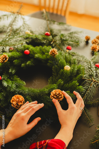 Woman Creating a Handmade Christmas Wreath in a Cozy Home Interior During the Holiday Season
