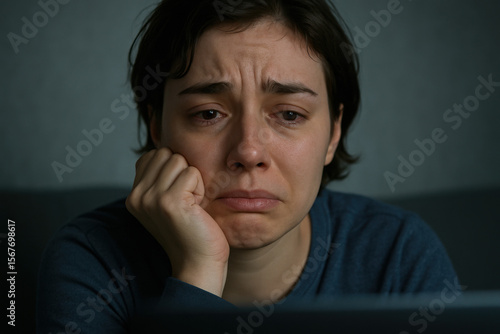 Woman Crying at Laptop: Close-up portrait of a young woman, deeply saddened, tears streaming down her face as she looks at her laptop screen in the dim light of evening.