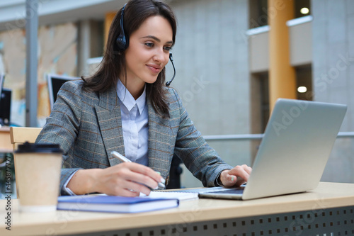 Woman customer support operator with headset and smiling.