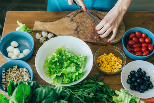 Woman cuts vegetables for salad on a cutting board. Cooking at home.