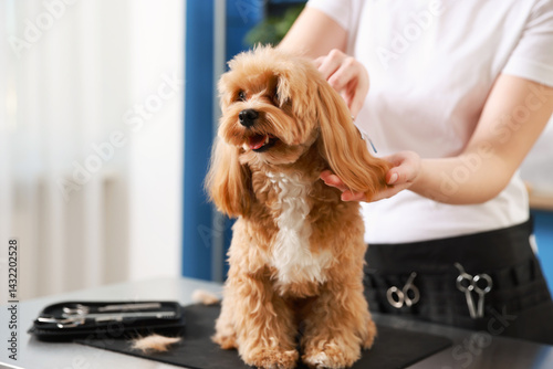 Woman cutting dog's hair with scissors indoors, closeup. Pet grooming