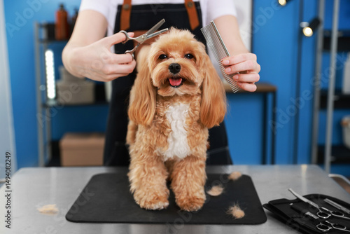 Woman cutting dog's hair with scissors indoors, closeup. Pet grooming