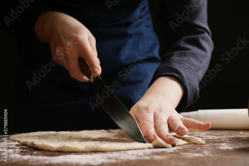 Woman cutting dough at wooden table, closeup. Cooking grissini