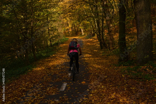 Woman cycling through autumn forest