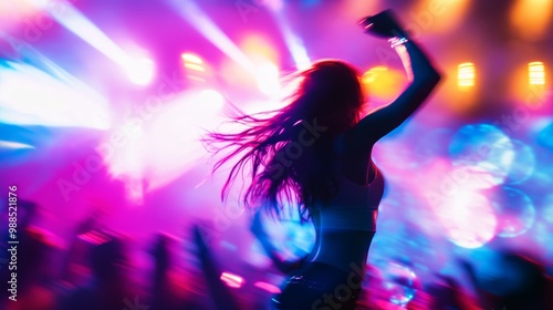 Woman Dancing at a Music Festival Under Colorful Stage Lights