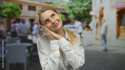 Woman daydreaming blissfully on a vibrant city terrace, surrounded by bustling street life and outdoor cafe ambiance, expressing serene happiness and tranquility.